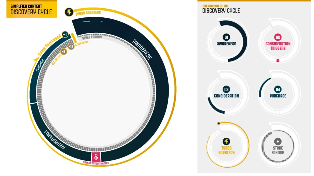 Infographics are one part serious research, another part art, and a little bit of visual science. The goal is always to make something that’s clear, memorable, and true to the user. For journeys like this, different visual metaphors are critical in grounding the viewer in the user experience. The shape of the journey line — whether wavy, branching, or looping — conveys the actual customer experience. We went with a looping cycle (as seen here) to show how gamers continue engaging with new content – which leads to purchases and increased fandom.