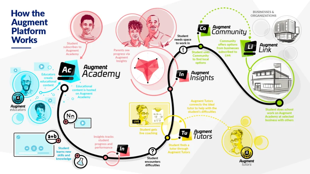 The journey below shows the touchpoints between the user and AugmentEd’s family of products. What emerges is an accessible view of the whole product suite, how they are used, and how they relate to each other. This helped investors quickly understand AugmentEd’s value offering.