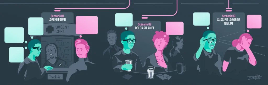 Places, situations, and emotions help us understand the user and their world. With infographics, we can depict all this information together, so people can quickly grasp everything in context. For example, in one infographic, we embedded insights into the vignettes below. Illustration humanizes data while avoiding PII (personal identifying information) concerns.