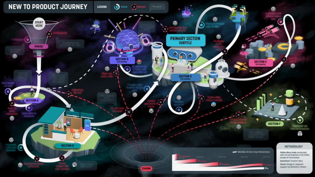 With graphics, you can skim or deep dive. You can also choose to ignore what isn’t pertinent to you. The user journey below shows insights for different parts of the product. Designers or engineers can easily refer to the areas they are working on. You can also quickly see the bigger picture emerge: a chaotic user experience with heavy churn.