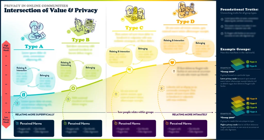Below is an example of capturing layers of information. This graphic educates developers about online communities and their privacy needs. Placing this information into a graph helps people quickly see how the group’s purpose, privacy needs, relational intimacy, and potential harms are all interconnected. The right panel further shows how groups can include some or all of these categorizations.