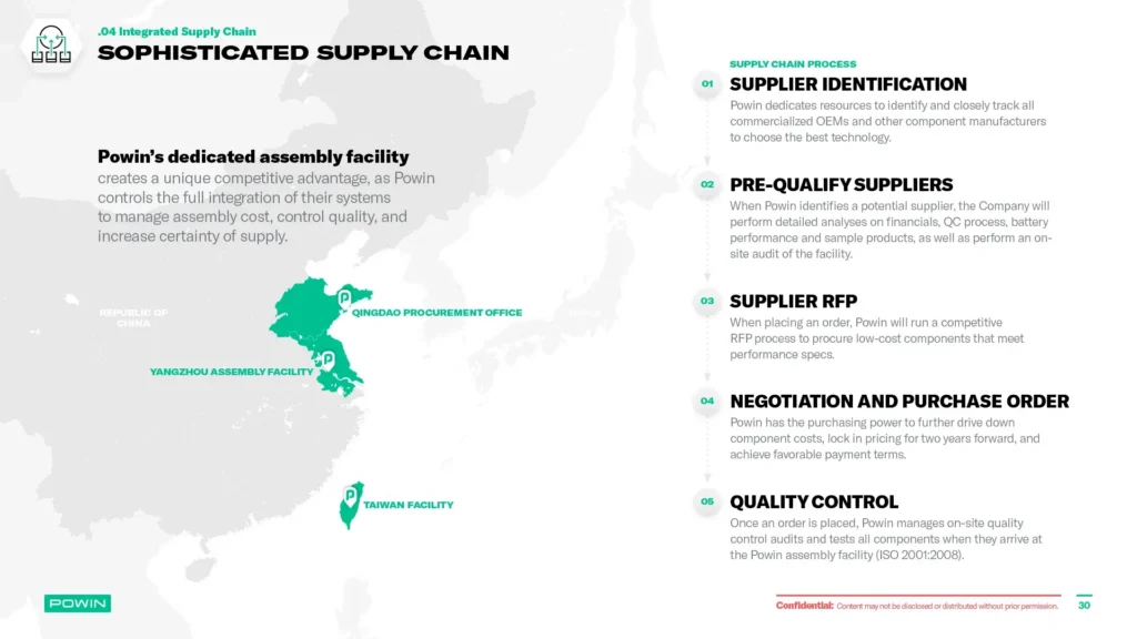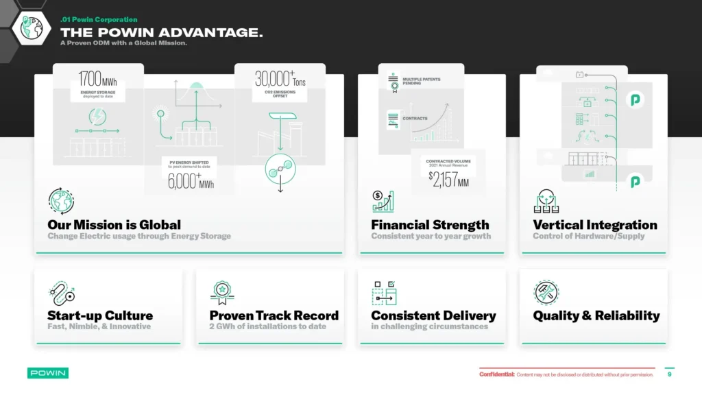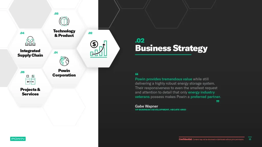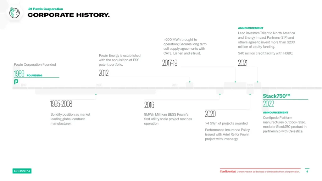 This corporate overview is aimed at investors. The above title slides and cover give readers a sense of the aesthetic, which draws from Powin’s branding. The “Corporate History” diagram below showcases the thin linework and condensed fonts used to convey precision and technology.
