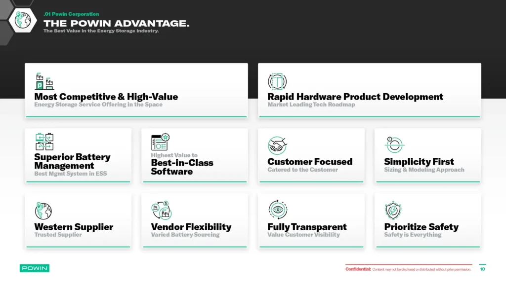 The three slides above are key in quickly explaining Powin’s competitive differentiators. Instead of using a simple bulleted list, I developed icons and diagrams to add interest and depth. The “Business Model” diagram especially helps demonstrate how Powin controls a far greater portion of the manufacturing chain than its competitors.