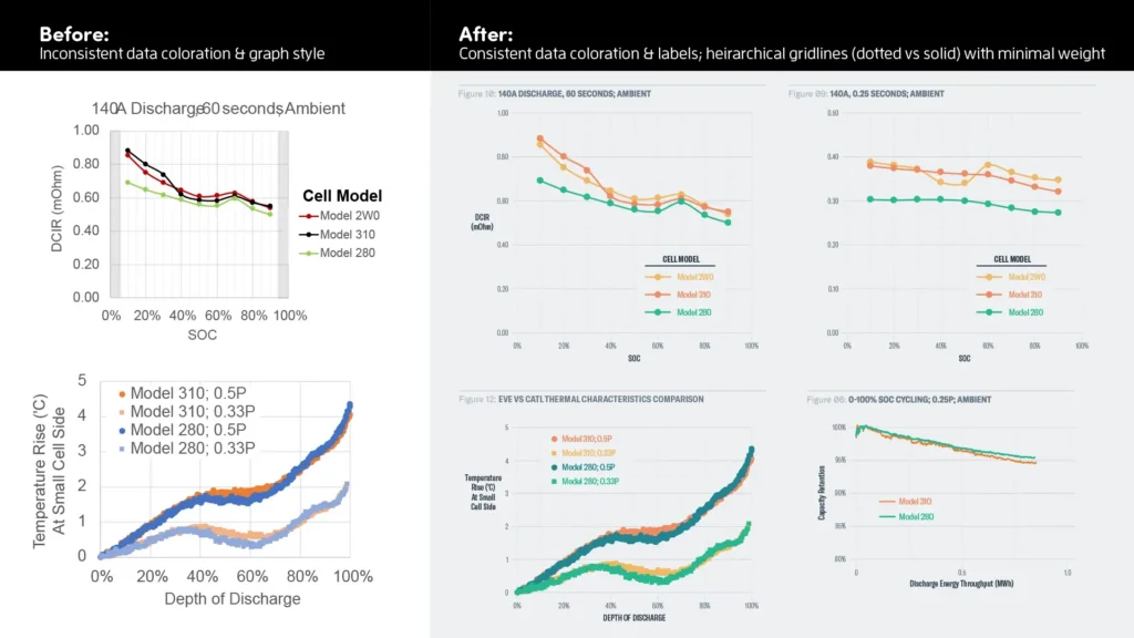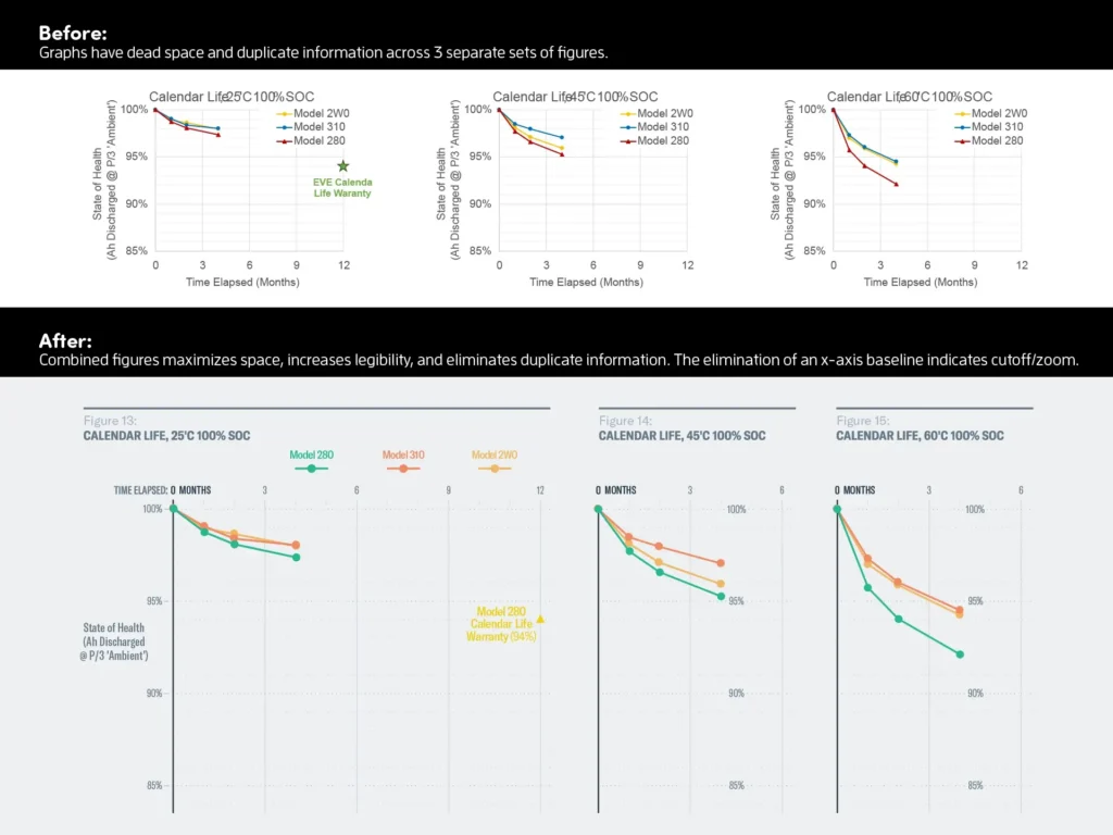 Persuasive visuals are governed by legibility. When I received the figure above from Powin, all eight chemistry rankings were layered into one hexagonal graph. The overlapping data impaired readability. To correct this, I split the figure into eight separate graphs. This made LFP’s superiority to other chemistries immediately obvious. By adding a key, I avoided redundant information and preserved simplicity.